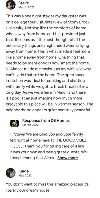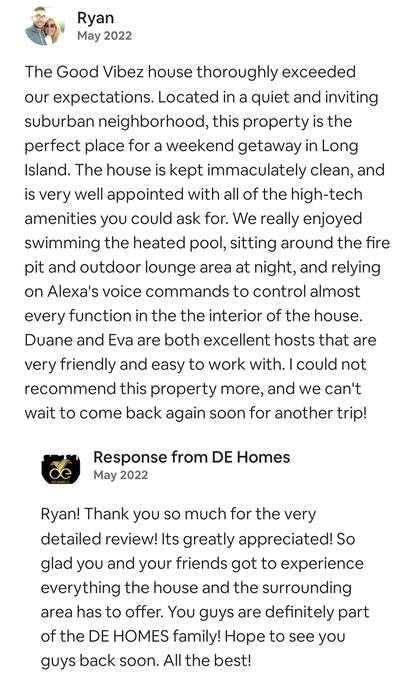 *NO PARTIES, LARGE GATHERINGS OR EVENTS* *POOL HOURS are from 8am to 10pm *QUIET HOURS are from 10pm to 8am. *No Amplified music no matter the time of day... especially after 10pm. If you choose to be outside after 10pm, please be considerate of neighbors and keep voice levels low. If using outdoor TV, please keep volume low at personal levels. *Due to town regulations & insurance purposes, we have a strict maximum occupancy of 7 guests. Only guests who are registered and authorized on the reservation are permitted on the property. If you plan to have visitors, even for a short visit without an overnight stay, please inform and receive approval from the hosts in advance. Approved visitors must leave the premises by 10pm. If any daytime visitors remain past 10pm, they will be considered overnight guests, and an additional fee of $200 per overnight guest will be applied to the reservation. Failure to comply with this policy may result in immediate reservation cancellation without a refund and/or a $200 fee per guest exceeding the 7-guest limit. We greatly appreciate your cooperation in adhering to this rule in advance. *No smoking, vaping inside of home. Smoking is allowed in the backyard only. There will be a $500 smoke smell removal fee if there's a smell of any smoke inside the house. * Pet fee: $49. Covers 2 pet limit. Pet fee covers extra deep cleaning costs. Please be sure to add pet when booking. Any additional pets over the 2 pet limit will result in additional $99 fee and/or reservation being cancelled with no refund. Please inquire first with hosts if you have more than 2 pets. *No pets in the pool *Check-in is at 4pm and Check-out is at 10am. When possible, we can accommodate an early/late check-in/out for a FEE. Cost & Availability is based on: 1) Hours requested 2) Cleaners schedule 3) If a guest is checking in/out the same day. Please let us know in advance for higher chances to be approved. *Our cleaners arrive promptly @ 10:00am. They charge $50 per 30 minutes they have to wait after 10:00am. *No illegal drug use in or around property whatsoever. That includes Marijuana/Weed. *Absolutely NO burning of any candles or incense sticks *There are security cameras facing the front and rear of the property (including pool and golf course). Security cameras are for the safety and security of all our guests and for insurance purposes. CAMERAS ARE NOT ACTIVELY MONITORED. Please do not remove, touch any cameras or disconnect, unplug WI-FI. This will result in the reservation being canceled without refund. *Noise level monitors are inside and outside the house (Minut). These do not record audio. Only monitors noise levels/decibels. (FYI...Alexa speakers on volume level 10 won't set these off. *No third party bookings-only agreed upon guests that are staying in the home can book the listing *Do not move or rearrange any furniture *DO NOT flush any baby wipes, sanitary items and make up wipes in the toilet. We run on a septic tank system. Additional charges will apply up to $500 due to any of these items clogging toilet * PLEASE limit all activities to inside home or in the backyard (not front of house) *Keep doors and windows closed at all times to prevent noise from traveling outside and to prevent heating/cooling system from overworking itself *ABSOLUTELY NO DIVING IN POOL!!! POOL GOES FROM 3FT TO 5 1/2FT. *NO Glass (plastic cups provided) by the pool area. Additional charges will be applied for clogged or damaged filter up to $1,000 *NO running by the pool *NO children under the age of 13yrs old left unsupervised in the backyard, especially by the pool without adult supervision. *No dogs in pool *Guests will be responsible for any BROKEN, DAMAGED, MISSING items. Additional charges will apply -ABSOLUTELY NO CONFETTI, NO SILLY STRING, NO FEATHERS AND BALLOONS. Any excessive messes will result in an additional $200 fee *We know accidents do happen. Please alert hosts of any damages immediately, so we can rectify and plan to repair as needed. **By booking with us, you are agreeing and confirming that: 1)You are a guest and NOT a tenant 2)You will check-in AND check-out at the agreed upon dates and times as written in the reservation. *Failure to comply with agreed check-out time, you will be considered Trespassing and will have to vacate property immediately. 3)You have read and agree to ALL house rules/rental agreement and that if any are broken, that may result in cancellation of reservation without refund. Disclaimer: We want to assure you that your privacy is of utmost importance to us. In our Airbnb property, we have installed Alexa devices in each room for your convenience. However, please be informed that these Alexa devices do not record audio or store any personal information. They are solely designed to provide you with a seamless and enjoyable stay. If, for any reason, you are uncomfortable with the presence of these devices, you have the option to unplug them during your stay. Your comfort and peace of mind are our top priorities, and we fully respect your preferences. If you have any questions or concerns about our privacy policies or the use of Alexa devices, please do not hesitate to reach out to our team. **Swimming Pool Waiver & Release of Liability Agreement** I, [Guest/Renter] & ALL guests/visitors, acknowledge and understand the risks associated with using the swimming pool located at The Good Vibez House (DE.HOMES8121 LLC) , a vacation rental property situated in Commack, Long Island. I & All guests/visitors also acknowledge that there is no lifeguard on duty at anytime. In consideration of being permitted to use the swimming pool, I hereby agree to release, indemnify, and hold harmless The Good Vibez House (DE.HOMES8121 LLC), its owners, agents, and employees, from any and all claims, demands, causes of action, damages, or liability arising out of or related to my use of the swimming pool. I (guest/renter), understand that swimming is inherently dangerous, and that 